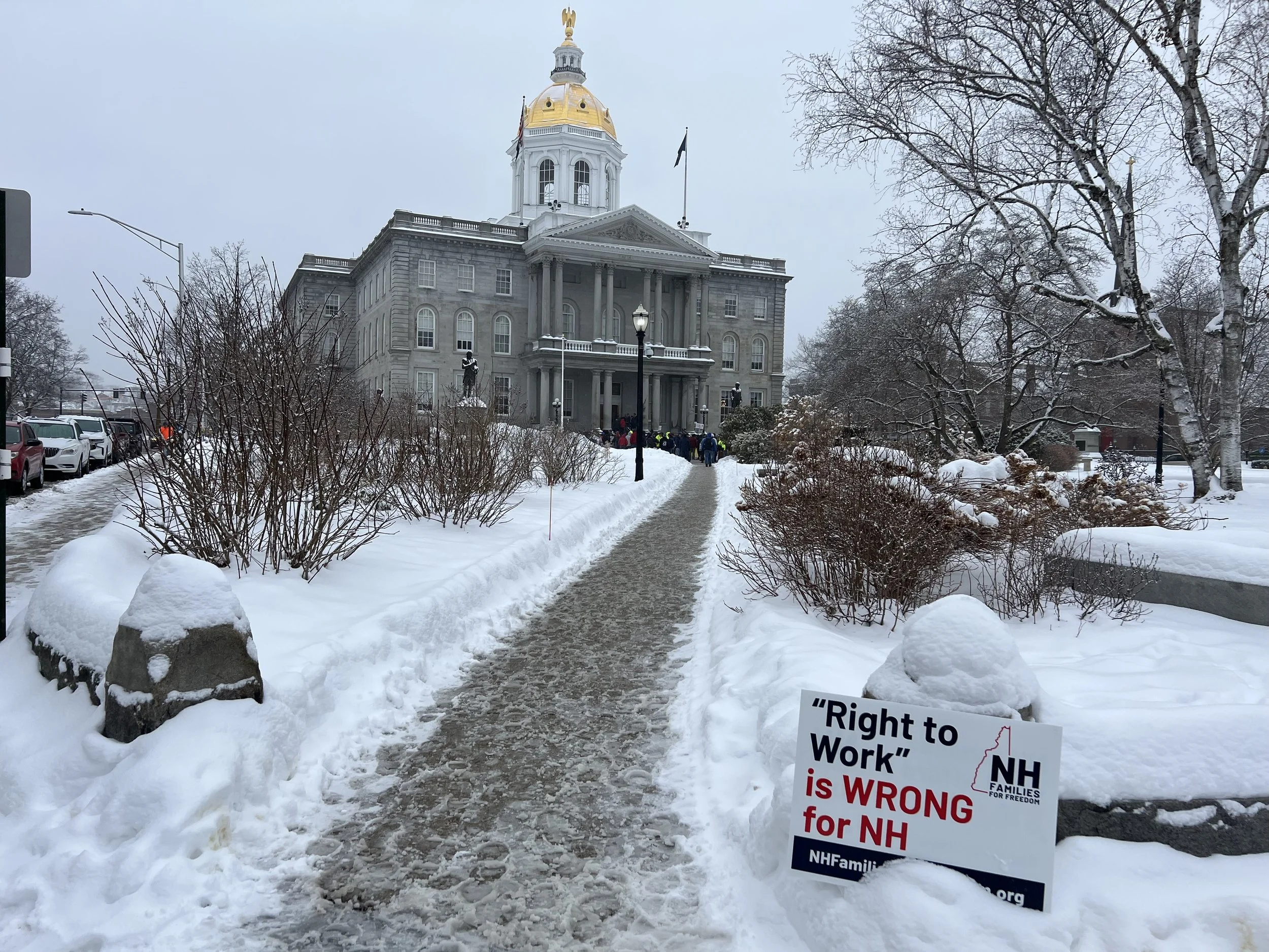 Right to Work (for less) Dies Again. By a 200-180 vote, the House voted to indefinitely postpone HB 238 , a bill prohibiting collective bargaining agreements from requiring employees to join or contribute to a labor union. The vote not only kills the bill for this session, but also prevents it from being brought back in any form for a vote in the House in any form. The bill was strongly opposed by New Hampshire labor unions, who turned out in force outside the State House in the middle of a snowstorm to greet lawmakers on their way in to vote. Speaking in favor of the motion, Rep. Stephen Pearson (R-Manchester), a firefighter and union member, told lawmakers, “You can’t make America great without American workers.” In all, 25 Republicans joined all 175 Democrats in attendance in voting to kill the bill. More.